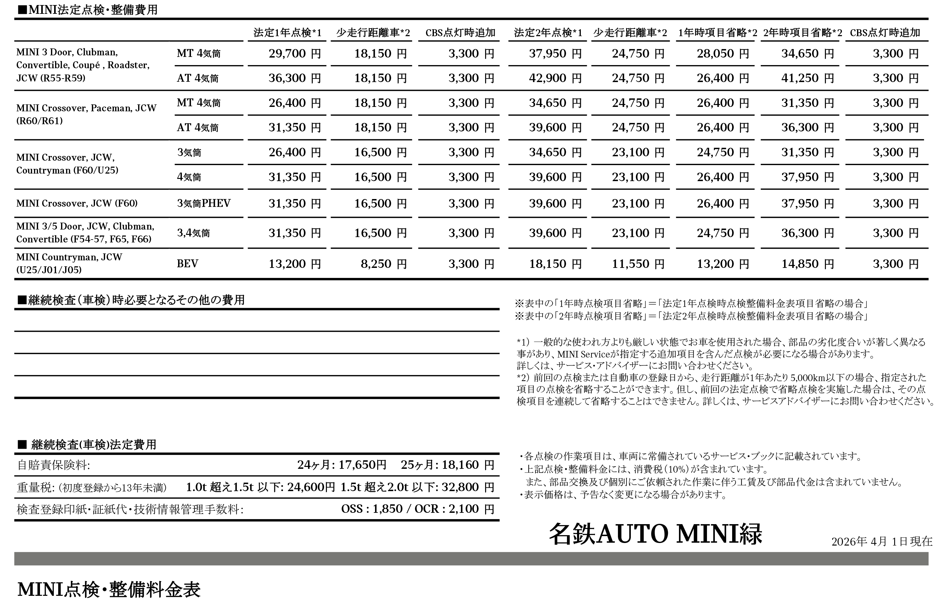 ※ 2026年4月1日現在の料金表です。